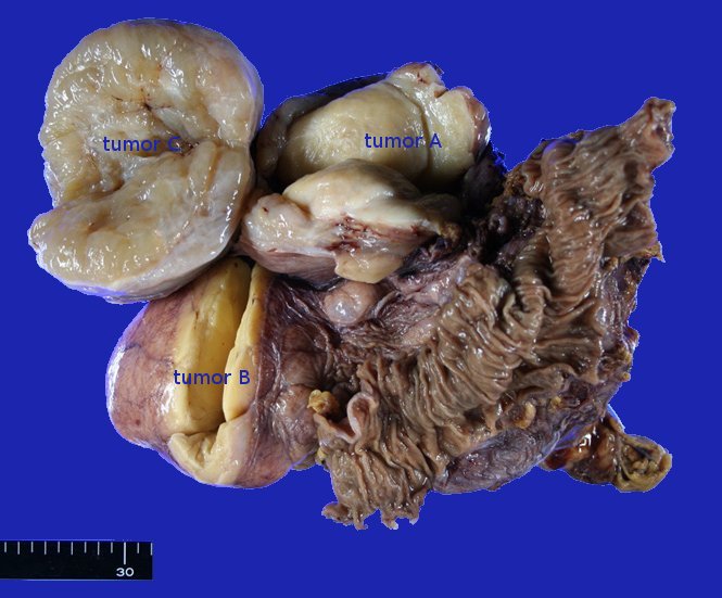 固定後の肉眼像。各tumorをA,B,Cとしました。Aは黄灰白色弾性硬。Bは脂肪腫と同じ外観です。
