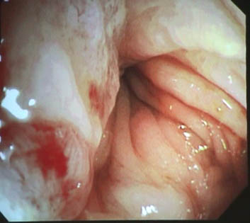 内視鏡所見:直腸は壁外圧排, S状結腸には壁外からの浸潤と思われる腫瘤があり狭窄している。この部位より生検