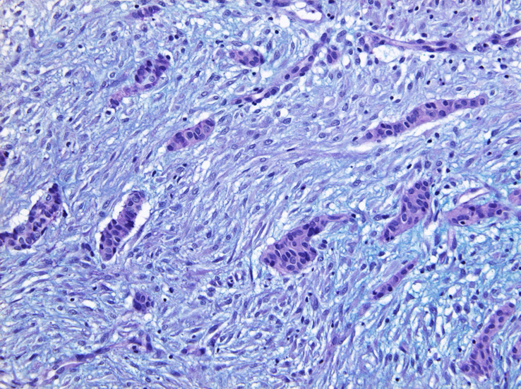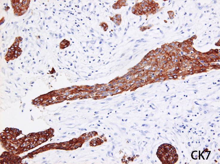 floar01: 大腸癌もdesmoplatic fibrosisを胞巣周囲にともなうので, 診断は難しいと思うんですけど, 腺癌ではないとしたのは、どの所見からですか?