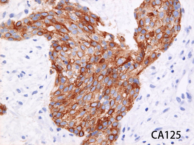 本例の腫瘍細胞も免疫染色でCA125が細胞質に陽性を示した。(右図)