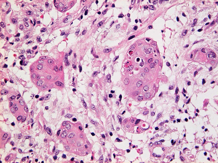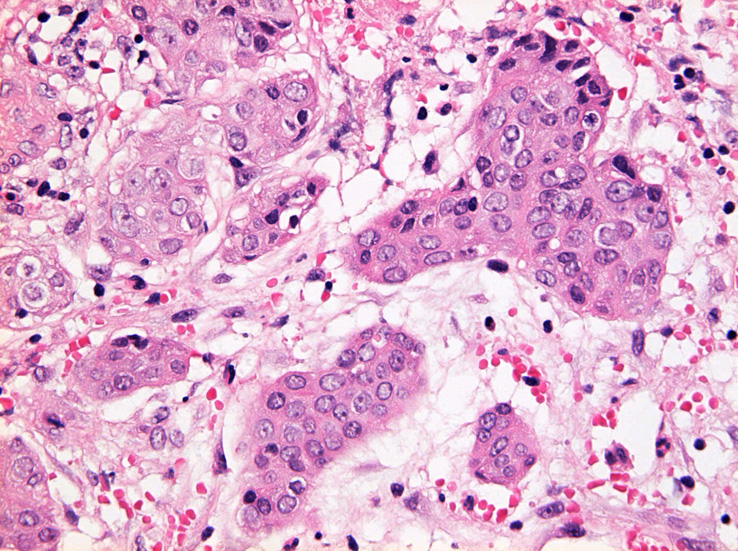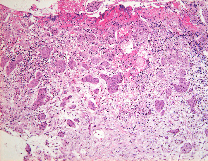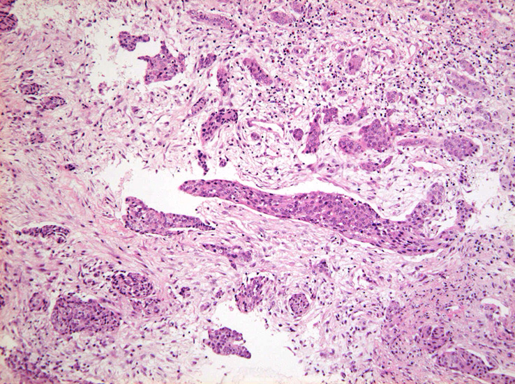 浸潤性増殖のわりに細胞は均一, そんなに異型性も強くない。apoptosisに陥った細胞が散在する。部位によっては胞巣状増殖細胞は細胞間橋がありそうな扁平上皮様に見える。深いところは線維性間質が増えてきて細胞は索状となりcarcinoidなども鑑別候補となるかもしれない。明らかな腺管形成, 粘液産生はみられない。35歳男性, わりとおとなしい扁平上皮癌様の組織か?と生検初見時に考えられた。desmoplasticな間質にもよく観察するとバラけた細胞異型が認められる。 (腫瘍胞巣①, ③)