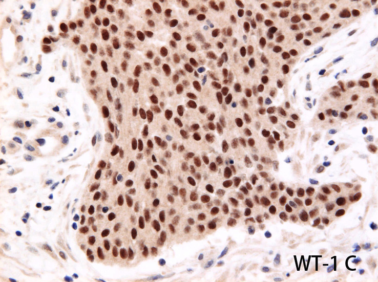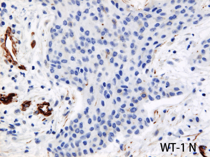 WT-1はc-terminus抗体に核陽性を示すがn-terminusは陰性となりDSRCTの所見に矛盾しない。遺伝子診断はしていない。(他院標本のため)