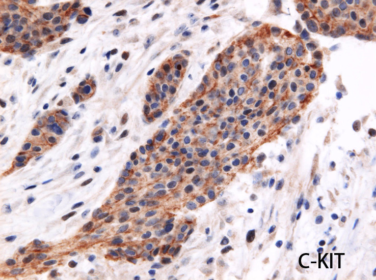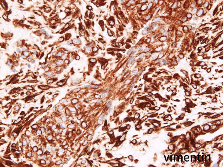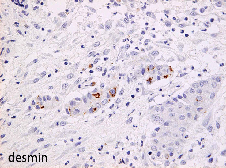 CK7陽性, vimentin陽性. 大腸腺癌は考えにくい結果。c-kit陽性と考えるが膜型かどうかやや不鮮明. desminが少数であるが陽性となる細胞あり。核周囲dot状といえる染まり。ひょっとするとdesmoplastic round cell tumorではないかと考えるようになる。