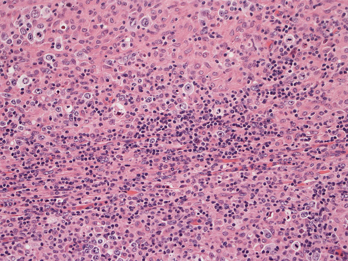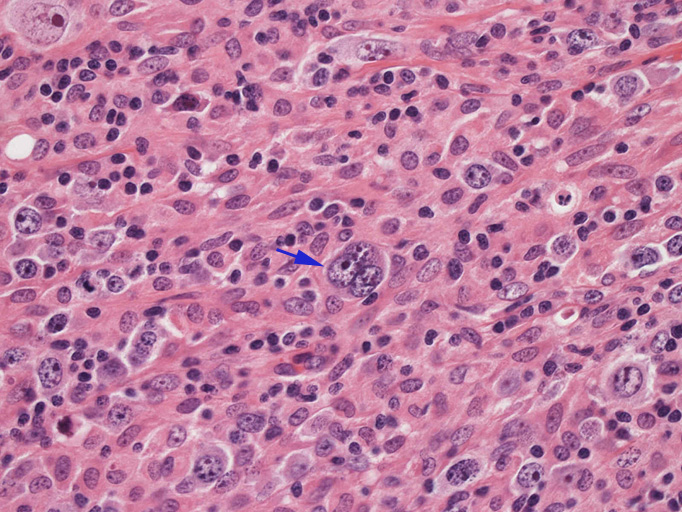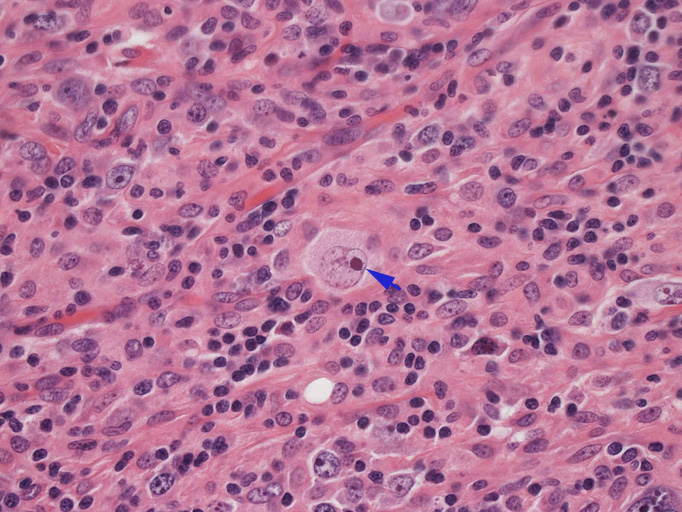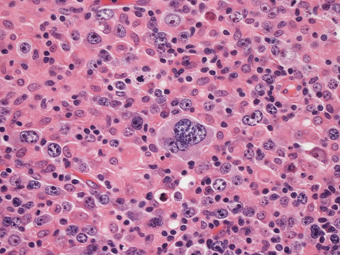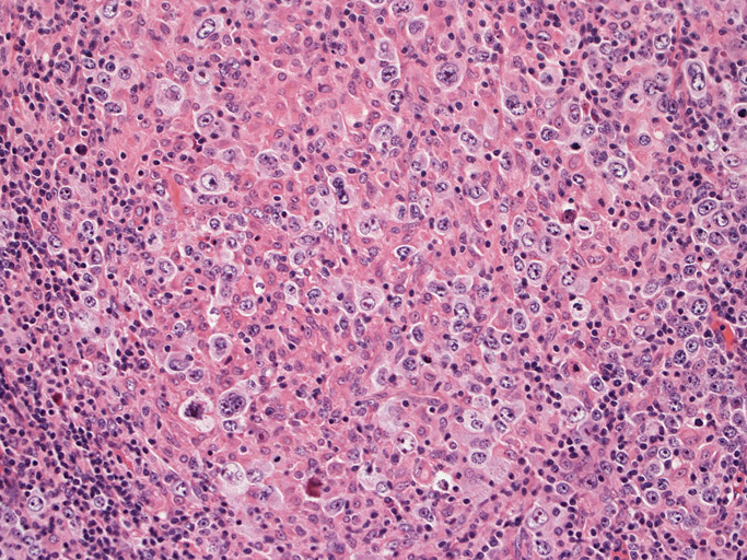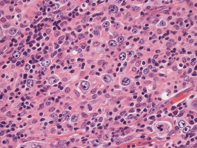 大型腫瘍細胞のシート状増殖はみられない。多彩な反応性背景をもちRS細胞様巨細胞が散在性に出現しホジキン病や反応性病変との鑑別が問題となる。