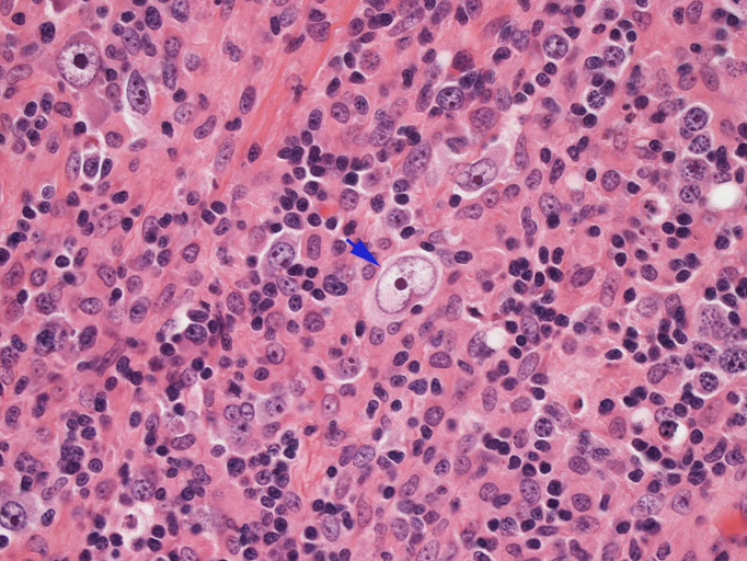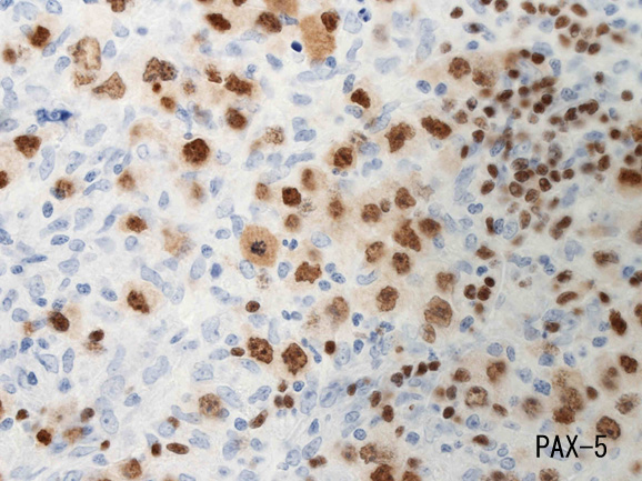 - RS細胞様巨細胞, LCLの大型細胞は B細胞マーカ(CD20, CD79a)が陽性。いずれかが消失することもある。通常腫瘍細胞の50%以上が陽性となりHodgkin病との鑑別点となる。