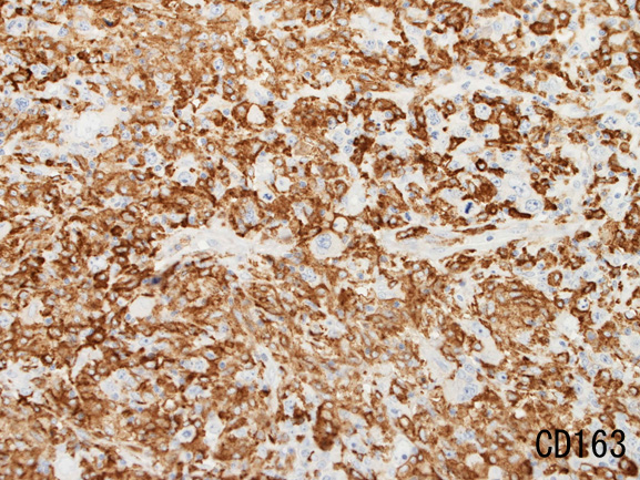 背景細胞はCD3+ Tリンパ球(CD8>CD4)とCD163, CD68陽性組織球。