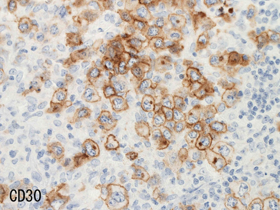 - ホジキン様節外病変の場合CD15が腫瘍性巨細胞に陽性であってもCD20陽性であれば本疾患とするべきであるとする考え方が最近Jaffeら*8により提示された。