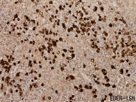 - EBウイルスを検出する抗体としてはEBNA2, EBERに対するin situ hybridization(EBER-ISH)とLMP1がある。EBER-ISHが最も感度がよく、LMP1は中間で、EBNA2が最も悪い。