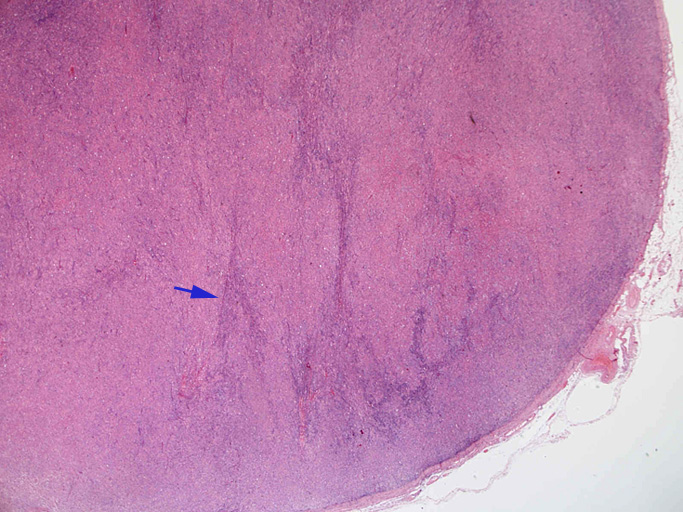 直径17mmの腫大したリンパ節。被膜は軽度線維性肥厚を示す。リンパ節の基本構造は失われ不明瞭な結節様構造が集蔟しているように見える。