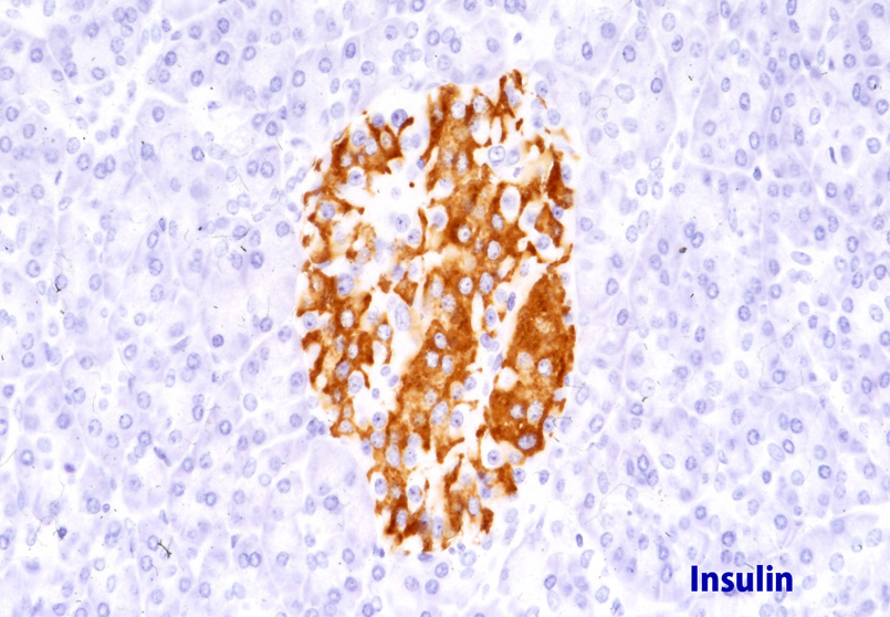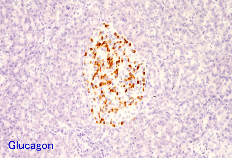 おのおの1個の内分泌細胞は1種類のペプチドホルモンを産生する-[Insulin(β細胞), Glucagon(α細胞), Somatostatin(δ細胞), Pancreatic polypeptide(PP)(PP細胞)]と記載する文献が多いが, いくつかの細胞は1種類以上のhormonを産生しているようで免疫染色でグルカゴン陽性のα細胞にgastric inhibitory peptide(GIP), コレシストキニン(CCK)やACTH-endophorinなどが陽性となるevidenceが得られているようである。*2