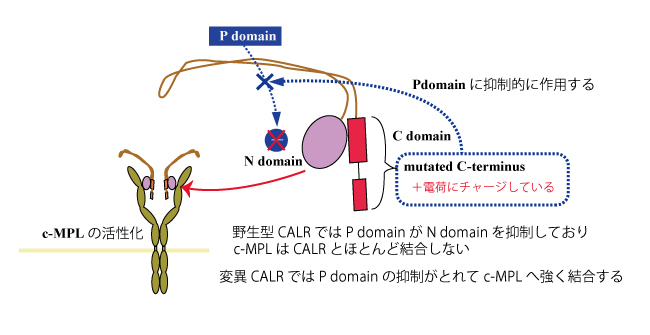 変異CALRは,C末端に野生型にはない正に荷電するアミノ酸配列を生じ, c-mpl(MPL)とCALR Nドメインの結合を抑制しているPドメインの作用をなくしてしまうことによりCALR変異型タンパク質とMPLの結合を来すようになる。野生型CALRはMPLには結合しない。*5
