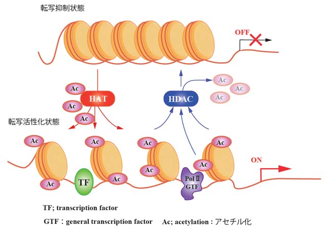 ヒストンにアセチル基が付加されるとヒストン-DNA間の静電的結合が弱くなる. これによりクロマチン構造が弛緩し転写因子などがDNAへ容易に結合するようになると遺伝子の発現が正に制御される.一方,アセチル化が除去されるとクロマチン構造が凝縮し,遺伝子の発現が抑制される.(右図)