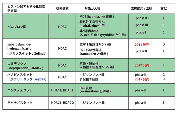 近年, 腫瘍のエピゲノム異常をターゲットとした治療薬として, DNAメチル化酵素阻害剤, ヒストン脱アセチル化酵素阻害剤が血液系腫瘍に対して効果を示しており, がん治療の新たな選択肢のひとつになっている。
