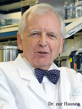 HPVは, 1949年, 皮膚乳頭腫病変より電子顕微鏡で確認された.*21983年にはドイツのzur Hausen博士により子宮頚癌組織にHPV type16,18 DNAが発見された。(写真はzur Hausen先生. この功績により,2008年ノーベル生理・医学賞授与)