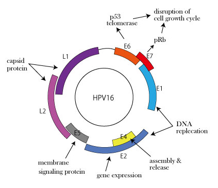 ウイルスは自身のE6およびE7蛋白質により, 宿主細胞を増殖サイクルに維持して、細胞の複製蛋白質が豊富な環境を整え自身の増殖に利用している。E6, E7蛋白はHPVがコードする癌蛋白質であり、HPV感染による発癌過程において重要な働きをしている。