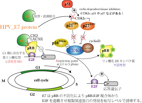 - また, CDKの活性はCDK inhibitor(CDKIs)とよばれる阻害因子による制御をうけている. このCKDIのうちp21CIP1/WAF1;, p27KIP1;とE7は直接に結合してこれらの阻害的活性を抑制する。結果的にcyclinD/CDK4の活性化は促進され, 細胞周期の回転, 細胞増殖が刺激される。