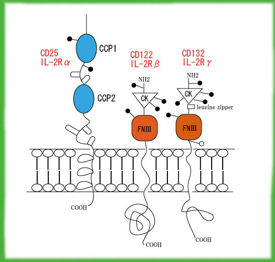 N側のCCP1(D1 domain)でIL-2に結合し, C側のCCP2(D2 domain)でIL-2Rのβ, γ鎖に結合すると推測されている。短い細胞内部分はリン酸化に関与するといわれる。