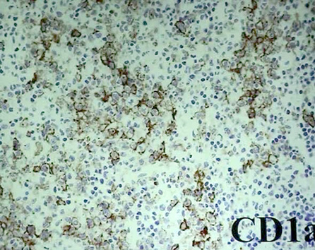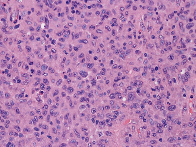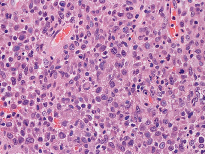 大型細胞の増殖よりなる腫瘍。縦溝,しわ,切れ込みのある核をもった大型細胞も出現する。クロマチンは顆粒状で核小体も明瞭である。核分裂は >50/10hpfと多い。eosinophilsは少ない。壊死が多発することがある。未分化ないし低分化な細胞像, 組織所見のため鑑別診断は多岐にわたり、的確な免疫染色を行う必要がある。