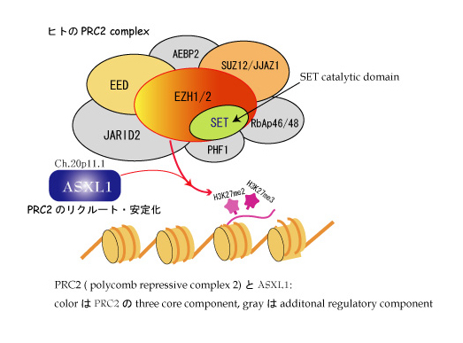 - 近年, ASXL1発現は, 転写抑制に働くヒストンのH3K27me3の発現量とつよく相関することが明らかになった。ASXL1の欠失は、H3K27のメチル化に必要な酵素複合体である, PCR2のコア蛋白がそろっていても, このヒストン修飾を完全に喪失させてしまう。