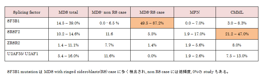 Yoshida*2らにより種々のサブタイプを含む29例のMDS症例解析から16例にこれらRNAスプライシング装置に関わる複数の遺伝子に変異が検出された。MDS(130/228;57%), CMML(48/88;55%), 二次性AML(16/62;25.8%)。