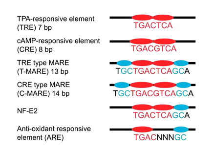 Maf転写因子はbasic region-leucine zipper(bZip)構造をもつファミリーを構成している。Mafは13から14bpの異常に長いDNAモチーフを認識する。このモチーフは Maf recognition element (MARE)と呼ばれる。MAREのシークエンスはAP1およびCREB/ATFファミリーにおのおの認識されるTREあるいはCRE(7 or 8bp)と同様のコアモチーフをもち, 両サイドにGC シークエンスが進展したもの。