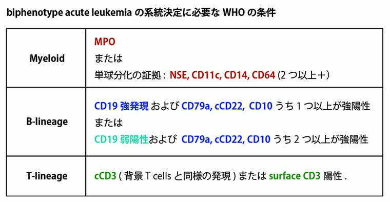 2) B-ALLまたはT-ALLの診断基準にあう単一細胞集団があり, 同時にmyeloperoxydase(MPO)を発現する場合. CD13, CD33, CD117(C-KIT)は骨髄系形質としての特異性は十分でない