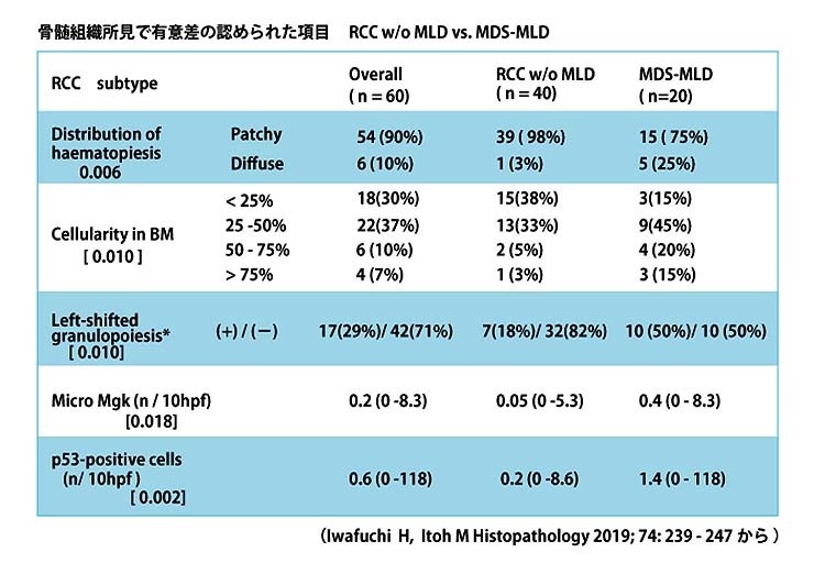 - 小児MDS-MLDでは, 過形成髄, びまん性造血細胞分布が通常認められ, left-shifted granulopoiesis(顆粒球系細胞のうちprecursorsが90%をこえる状態と定義), micro Mgk, p53陽性細胞の頻度がRCC without MLDに比較して高頻度に認められた.