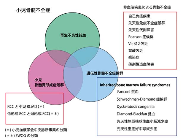 小児において汎血球減少と骨髄低形成がみられた場合には, 感染症や自己免疫疾患, 代謝異常など非造血性疾患をはじめ先天性骨髄不全症候群が背景に存在しないかどうかの鑑別診断を慎重におこなう必要がある.