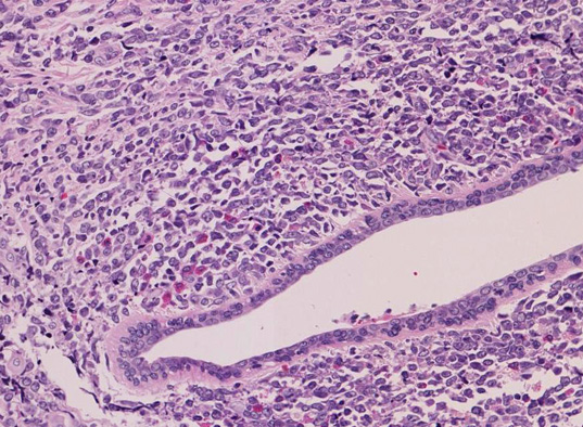 乳管をring状にとりまくように異型細胞が浸潤増殖している。増殖細胞は小型核小体をもつ, クロマチンの繊細な明るい大型類円形核, 淡明または弱好塩基性細胞質の境界不明瞭な細胞。核所見からは幼弱な細胞の増殖と考えられる。細胞の結合は弱く, リンパ腫や血液系細胞などが鑑別になる。乳管上皮間に異型細胞浸潤は見られない。(乳腺リンパ腫に多いMALT typeとは細胞所見, 浸潤所見がまったく異なっている)部分的に好酸球浸潤があり, 大型の単核好酸球など出現する好酸球にも異型があるように見える。