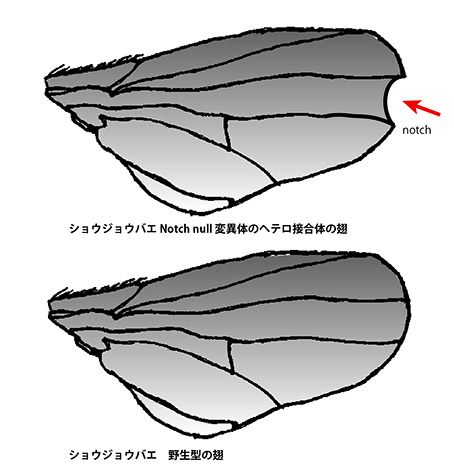 1913年, Thomas Hunt Morgan の研究室で切り込みの入った翅をもつ雌のショウジョウバエが見つかった. 翅の先端がわずかに欠けた変異体はNotchと名付けられ, 研究が始められた.