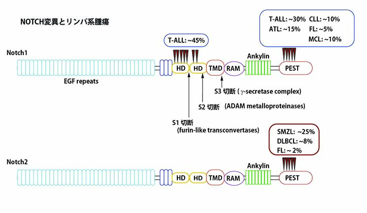 Notchシグナル経路は,ヒトの疾患との関連があるために薬理学的な介入に向けた興味を加速させてきた。重要なことは,NICDの核内への蓄積に結び付くようなNotch受容体の活性化型変異は,成人T細胞急性リンパ芽腫性白血病及びリンパ腫に共通していることである。さらに,機能欠失型のNotch受容体及びリガンドの変異は,アラジール (Allagille) 症候群や,常染色体優性型の大脳動脈症であるCADASILなどの数々の疾患への関与が示唆されている。