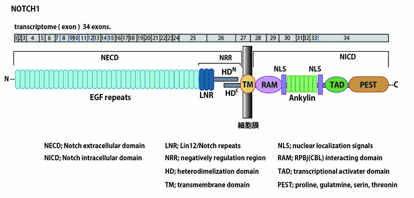 Notch受容体は,1回膜貫通型タンパク質で機能的な細胞外ドメイン(NECD),膜貫通ドメイン(TM),及び細胞内ドメイン(NICD)からなる。