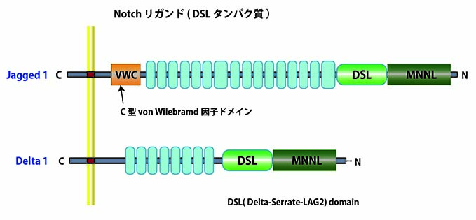 Notchシグナル受容体のリガンド, DeltaとSerrate(哺乳類ではJagged)は, 受容体とおなじくI型膜貫通タンパク質であり, シグナルの活性化には2つの細胞が隣接し, 細胞表面上でリガンドと受容体が直接結合することが必須である.