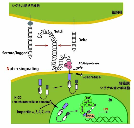 リガンドとの結合によりNotch受容体は構造変化をおこし, タンパク質切断酵素のADAM protease, およびγ-secretaseによって細胞内領域(NICD)が切り離される.