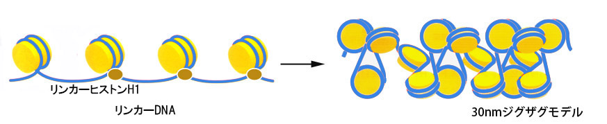 染色体DNAはヌクレオソームのつらなった構造をとるが、生体内でクロマチンがのびた状態になることはめったにない。ヌクレオソームは次々に重なって規則的な配列をつくりその中でDNAはさらに凝縮した構造, 30nmのクロマチン線維を構成する。