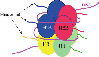 ヒストンコアはヒストン分子H2A, H2B, H3, H4の8量体からできている(右図)