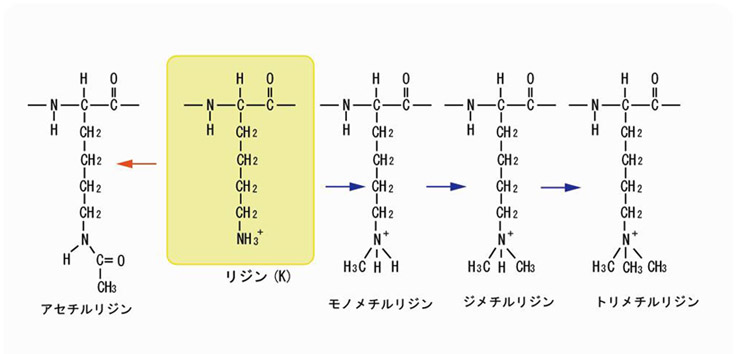 リシン(K)のメチル化には度合いの異なる3種類が存在する。それぞれ異なる結合タンパクに認識されるため細胞にとって違う意義をもつことになる。アセチル化はリシンの正電荷をなくすことに注意。''アセチル化したリシンはメチル化を受けず, その逆もいえることが重要である(=リシンのアセチル化とメチル化は競合反応である)。*2 メチル化を記号で Kme, Kme2, Kme3と表現する。