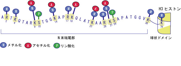 H3 ヒストンコアタンパクの修飾でよく調べられているものを図左に示す。大文字はアミノ酸記号。 M:メチル化, A: アセチル化, P: リン酸化 U: ユビキチン化