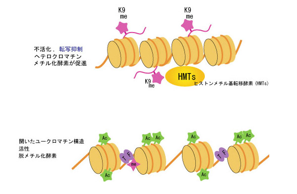 クロマチン構造には転写因子等との反応性に富む活性型とコンパクトに凝縮した抑制型があり、これらの形を継承するか相互に転換するかが制御機構の基本形となっている。