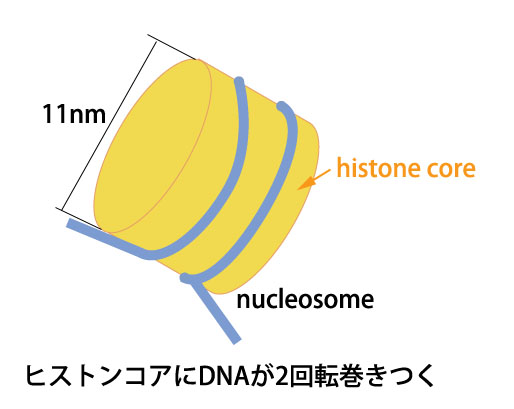 DNAの巻きついた糸巻き構造はヌクレオソーム・コア粒子とよばれヒストン(histone)タンパク質よりできている。8個のヒストンタンパク(ヒストンH2A, H2B, H3, H4がそれぞれ2分子づつ)と147塩基対の二本鎖DNAの複合体である。コア粒子同士は数塩基対から約80塩基対の長さのリンカーDNAで隔てられている。