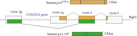 9p21に局在する, 6.6Kbの遺伝子で3つのexonをもつ. 異なる2つのexon1 (exon1β, exon1α)からの転写・翻訳によりframe shiftをおこして全く異なる2つのタンパク質, p16(INK4a)とp14/ARFを産生する。p16とp14はいずれもがん抑制機能をもつタンパク質である。( 注:p19/ARFはマウスのタンパク質)