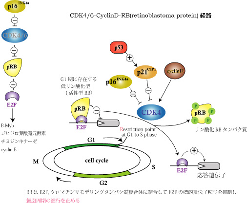 p16/INK4aはサイクリン依存性キナーゼCDK4/6を阻害し, CDK4/6-CyclinD-RB(retinoblastoma protein)経路により細胞周期を制御している。--->詳しいp16/INK4a(CDKN2)のページを作成しました.