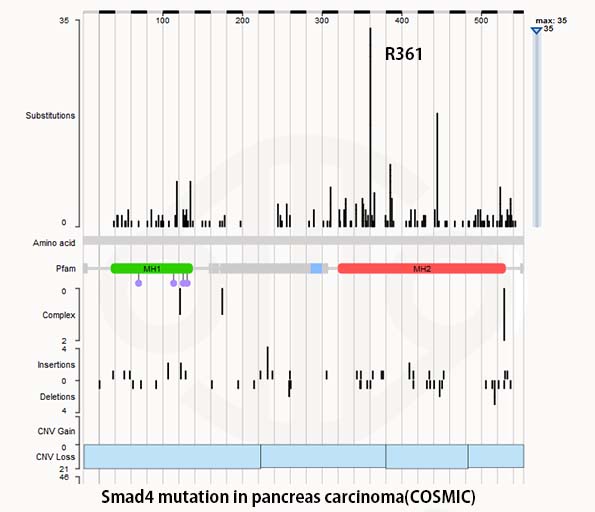 ヒトがんにおける, Smad4遺伝子の変異のほとんどはミスセンス, ナンセンス変異あるいはフレームシフト変異が遺伝子の mad homology 2 region (MH2)におこっている。