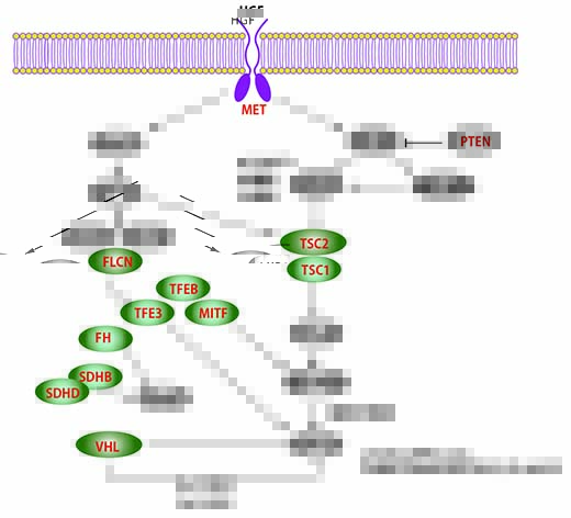 右図;腎癌の遺伝的背景. 赤字の遺伝子は遺伝性腎がん症候群に同定された遺伝子. これらの遺伝子はすべて共通した酵素, 鉄, 栄養素やエネルギー感知経路を通じて相互に作用しており, 腎がんが基本的には代謝性疾患であることを示している.*42