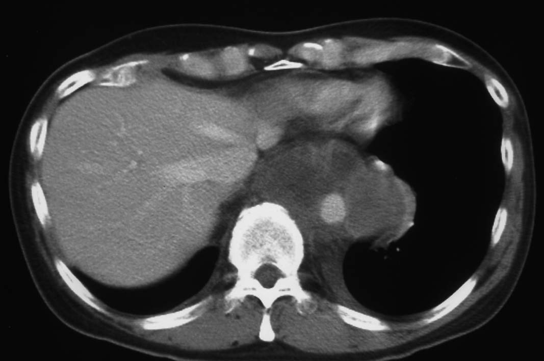 初診から11ヵ月, 胸部つかえ感出現. CTで気管分岐部から横隔膜食道裂孔を通り, 腹腔内へ進展, 食道および大動脈を囲繞する巨大な腫瘍が再発した. 他院での抗がん剤感受性テストの結果より, CDDP+5FUによる化学療法がおこなわれたが効果乏しく全身状態悪化. 呼吸不全が進行し初診より約1年の経過で永眠された.