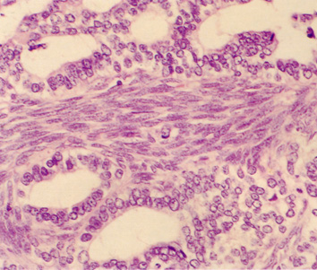 2. monophagic fibrous type; 線維肉腫様の紡錘細胞のみが増殖し上皮様細胞はみられない。
