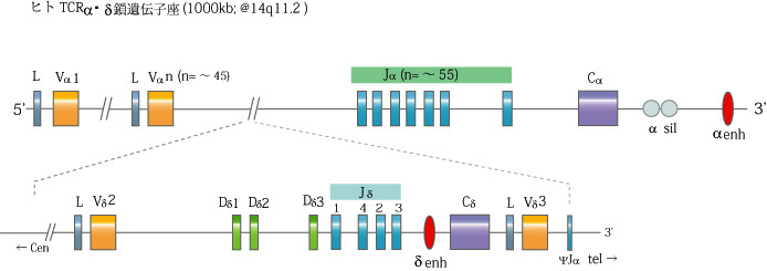 - δ鎖をコードするすべての遺伝子断片はTCRα遺伝子座内にありVαとJα遺伝子の間に散在している。