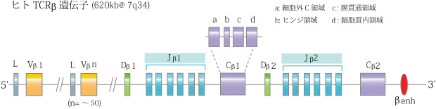 - TCRβ遺伝子は7q34に685kbにわたり局在している。TCRγ, TCRδ遺伝子と異なり, β遺伝子のV領域はより複雑となっている。約65のVβ遺伝子エレメントが存在し、名称のつけ方には2通り(Ardenら, Weiら)がある。Vβ遺伝子は34のファミリーに分類される。異なる名称のつけ方がRowenらにより提唱され, この30のVβ遺伝子サブグループはIMGTにより採用されている。(IMGT: the international ImmunoGeneTics database-->IMGT web page)