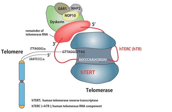 telomeraseは逆転写酵素であるTERTと, RNAサブユニットのtelomerase RNA component (TERC)を中心としたRNAタンパク複合体で 正常では, embryonic stem cellおよび一部の成人stem cellなど限られた細胞のみで活性化されている.(通常の体細胞ではTERT発現はなく, telomeraseは活性化されていない)