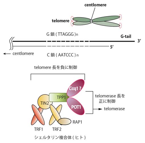 テロメアを構成するタンパク質としては, 6種類のテロメア特異的タンパク質からできたシェルタリン複合体(shelterin)が中心的な役割を果たしている.